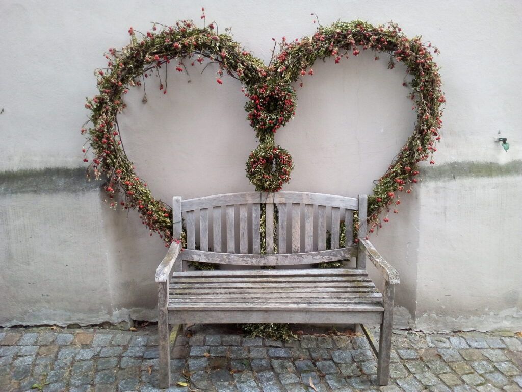 Geschmückte Bank bei einem Blumenladen in Nördlingen