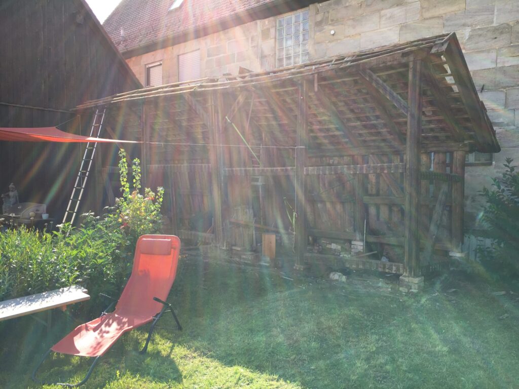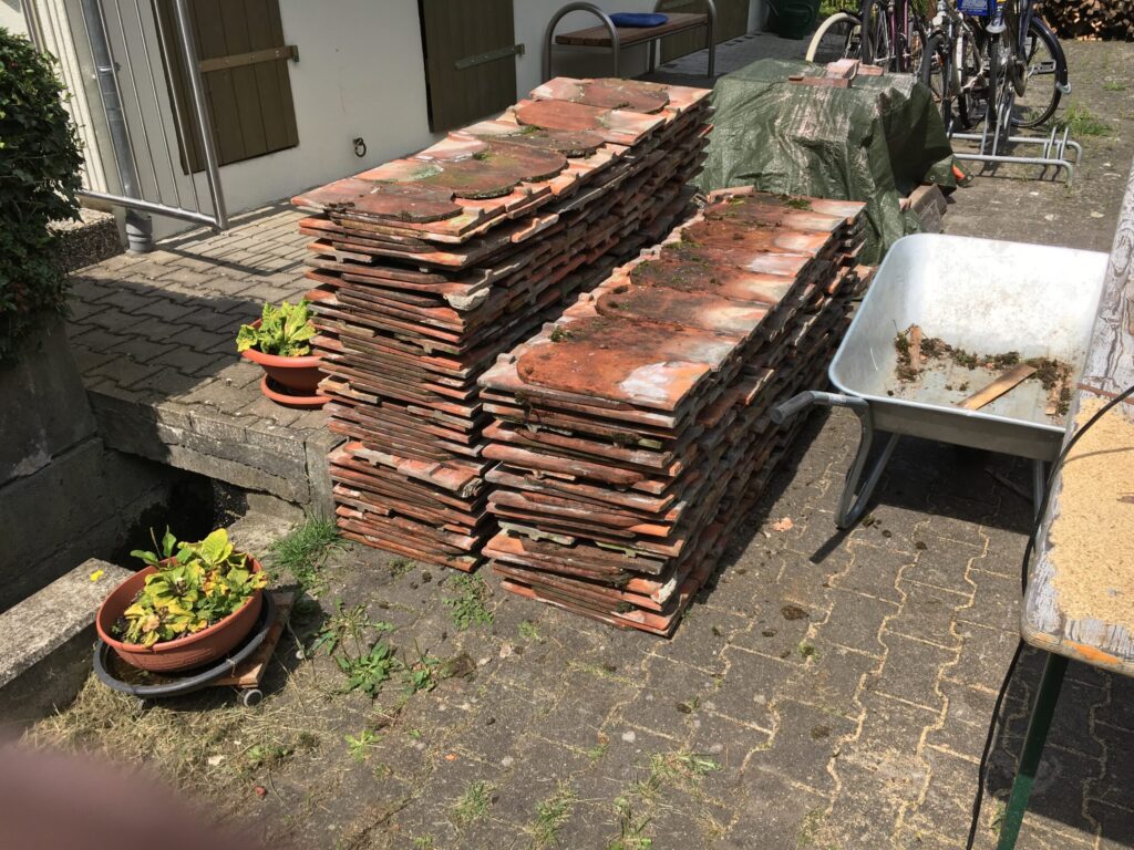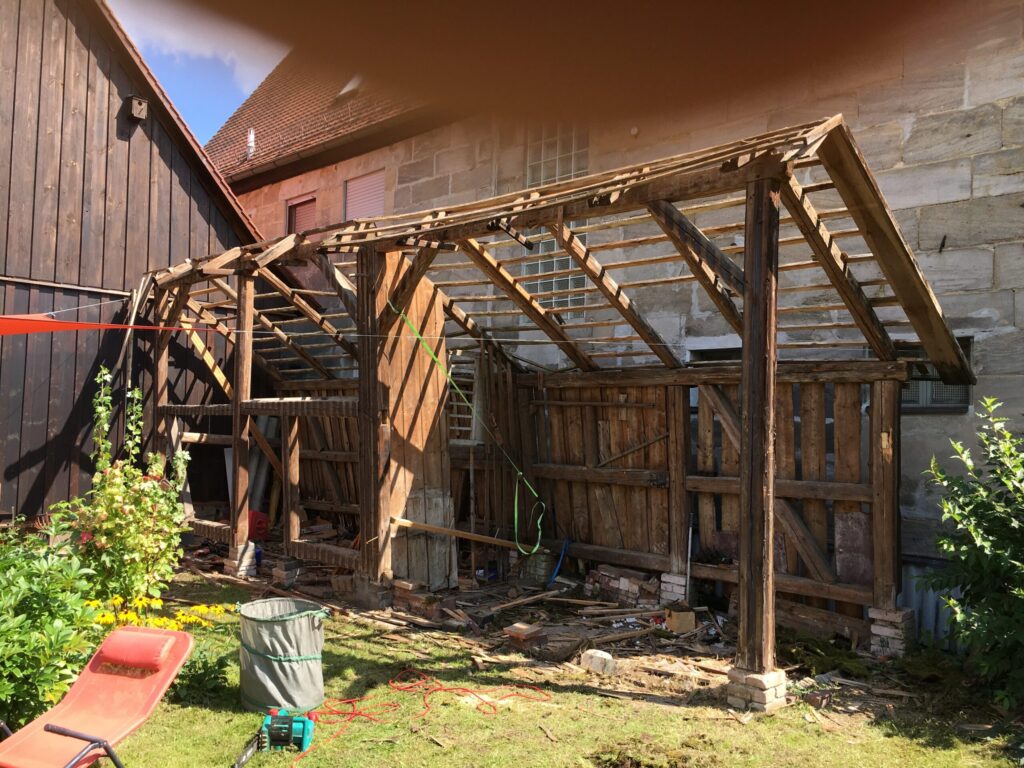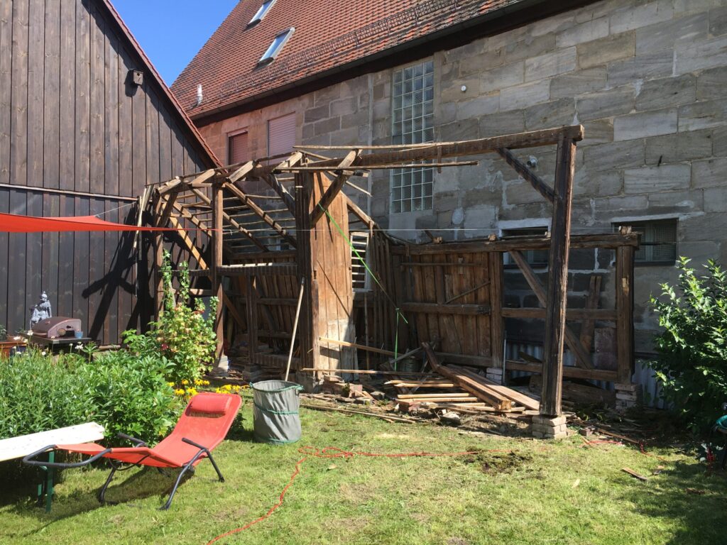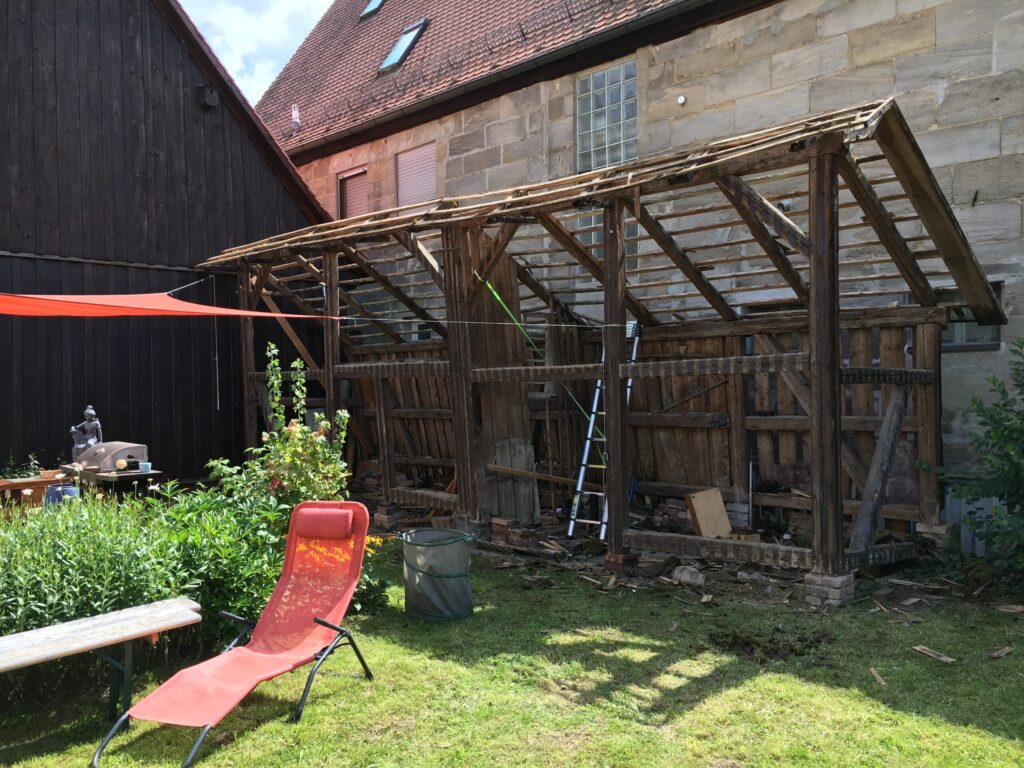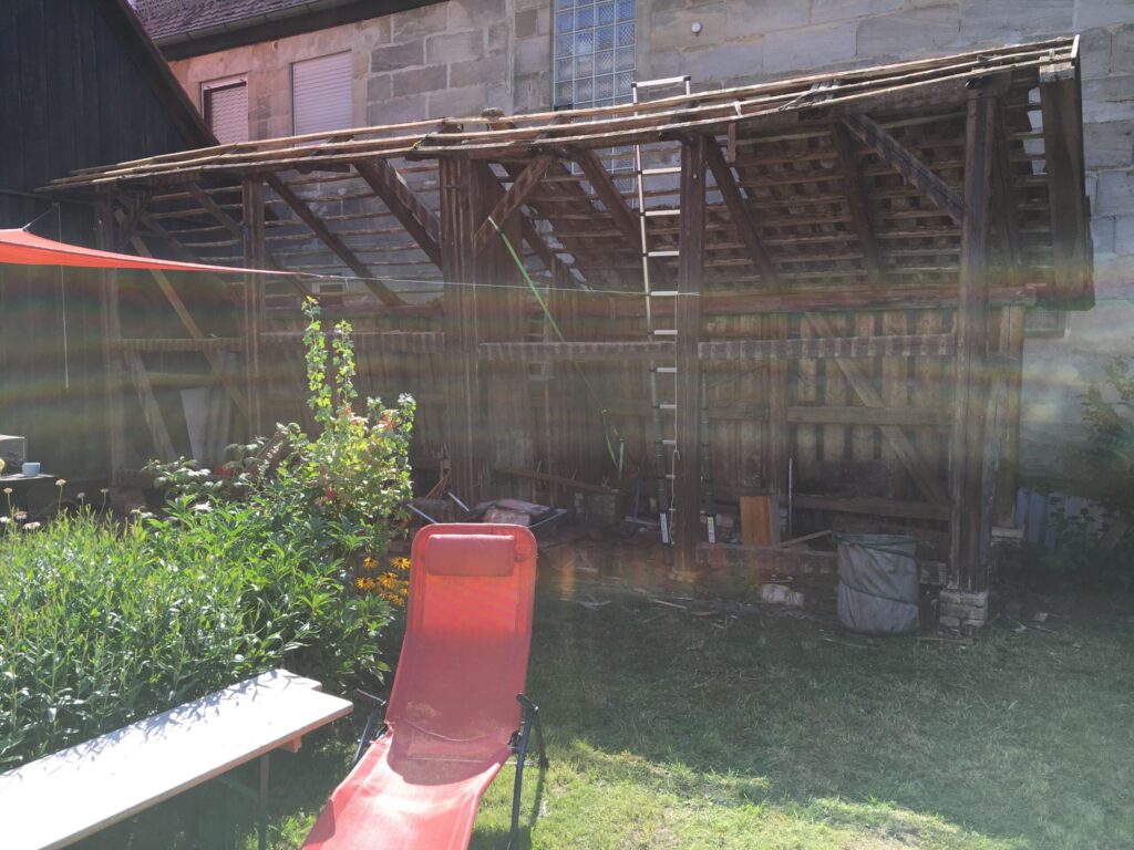 Seit Samstag also Abriss. Auf die „Sanfte“ Art. Wir wollen ja den Garten und das Nachbarhaus weitestgehend unversehrt lassen. also Latten entfernen, Dachplatten herunternehmen, Gebälk vorsichtig zerlegen.