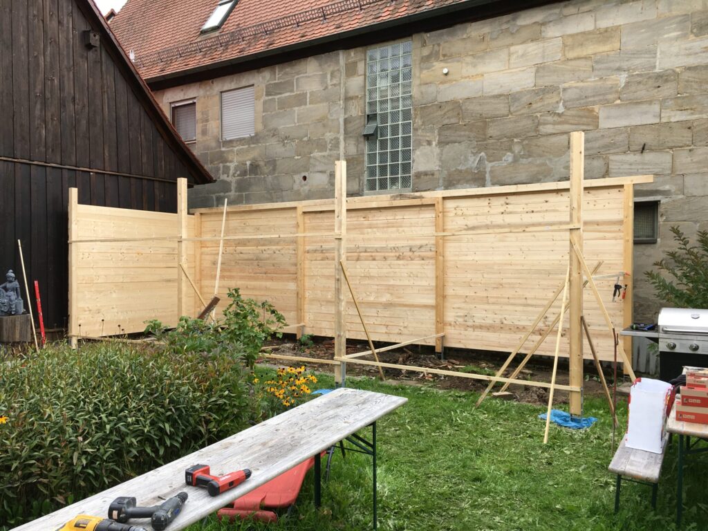 Unser Ersatzbau des Schuppens entsteht weiter. Gestern wurden die vier vorderen Pfosten gesetzt, heute schon die Rückwand und eine Seitenwand angebaut: