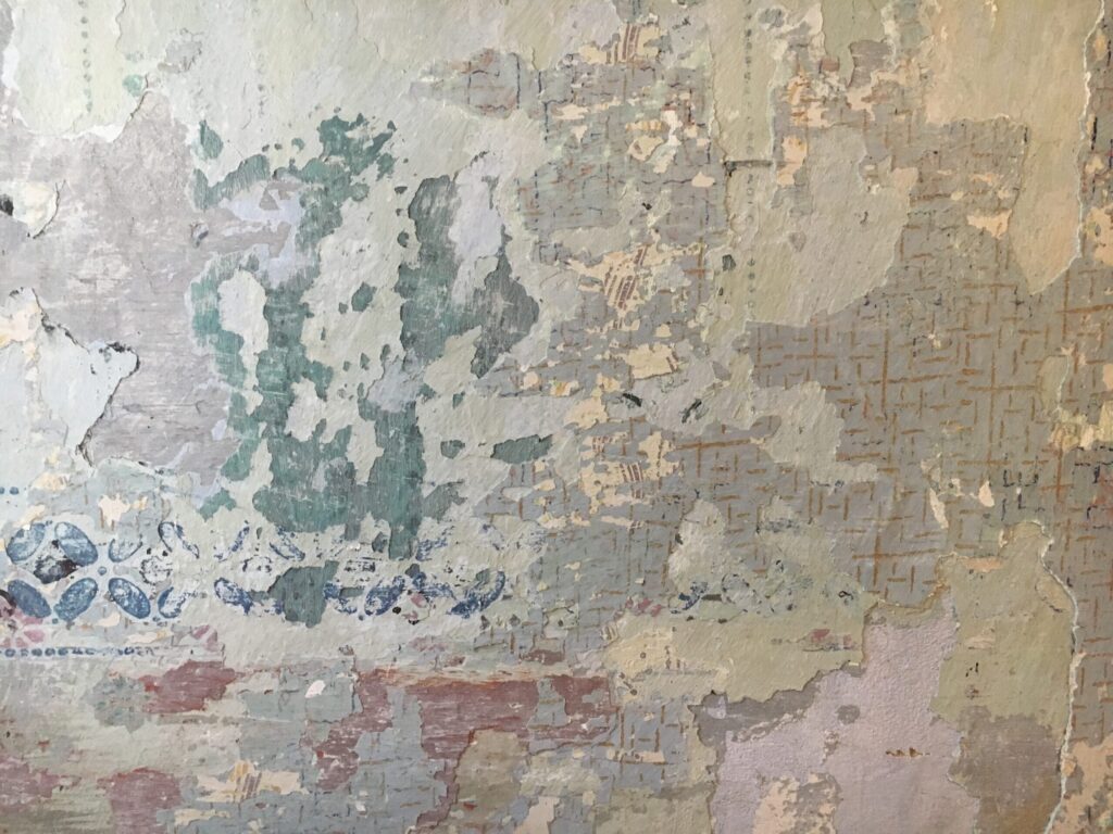 Die im Flur oben von der Tapete freigelegte Wand läßt erahnen, dass auch früher verschiedene Geschmäcker geherrscht haben. Zwei Lagen Mustertapete überdeckten mehrere Schichten Farbe, die mit Muster versehen waren.