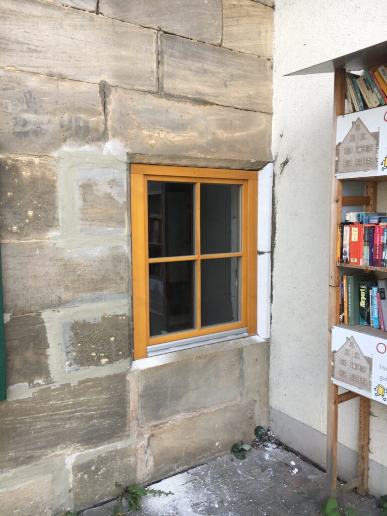 Ursprünglich war an Stelle des Fensters die Hauseingangstüre, deshalb ist die Außenansicht auch anders als bei den Fenstern im Erdgeschoss. Die Fenster hatten alle Fensterläden, die in einen Falz in der Sandsteinfassade eingeschlagen sind. Außerdem haben sie auch einen Sandstein-Außenfenstersims. Bei der ehemaligen Türe hat der Sandstein außen eine Fase, die Brüstung wurde, als die Haustüre auf die der Straße entgegengesetzten Seite eingebaut wurde, einfach zugemauert und dann für ein wenig Lichteinfall die Glasbausteine eingesetzt.