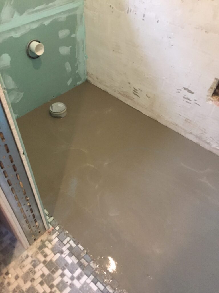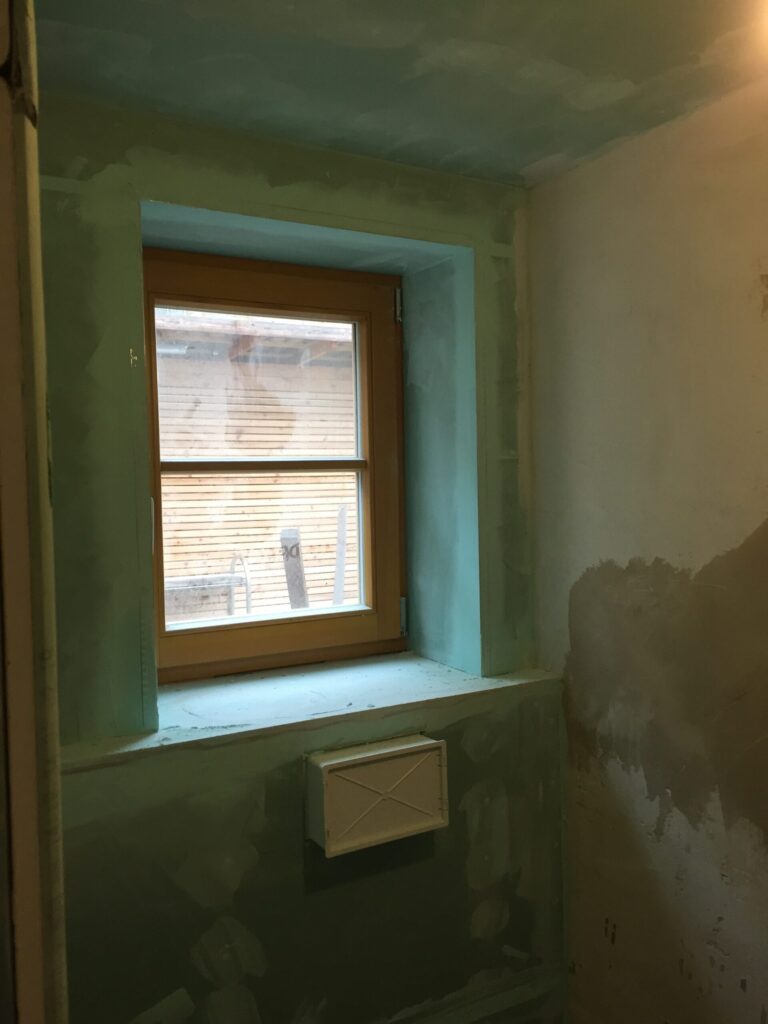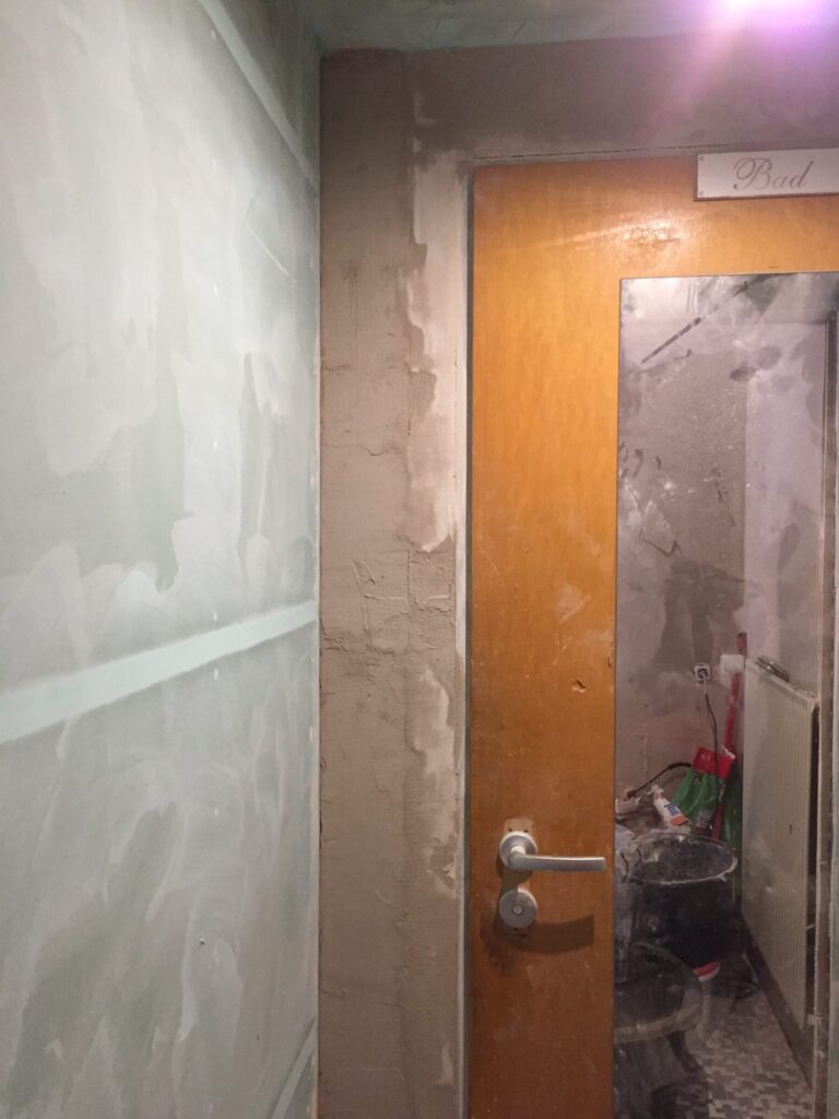 Gipskarton geschliffen und zum zweiten Mal gespachtelt, die Leitungsschlitze verschlossen, den losen Mosaikboden im WC entfernt und den Boden mit Ausgleichsmasse auf ein Niveau gebracht.