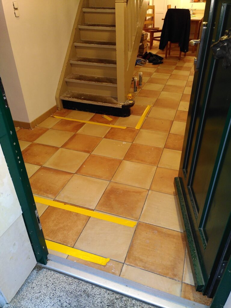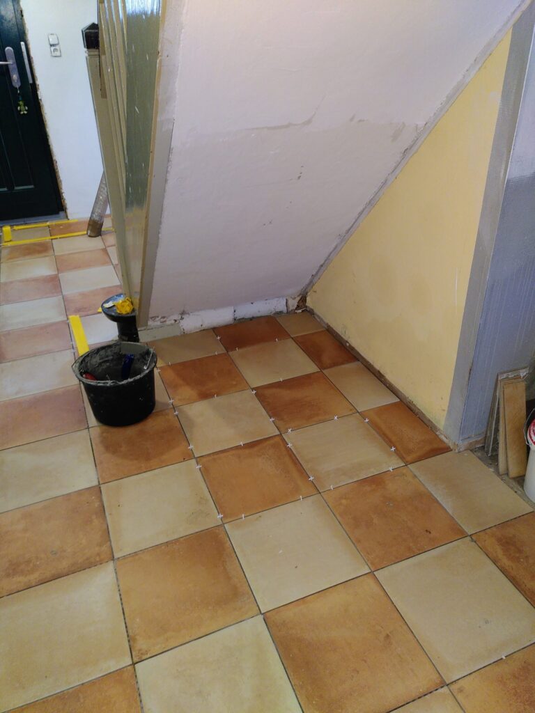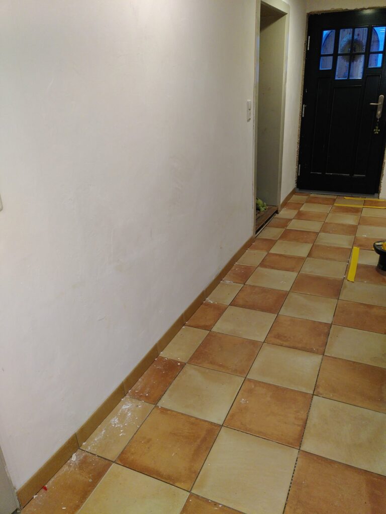 Ein weiterer Tag für den Flur. Fliesen fertiglegen, Flurwände grundieren und mit Streichputz fertiggemacht, ebenso die Decke im kleinen Flur vor Erdgeschoß-Bad und -WC, zum Schluss noch die Sockelfliesen, die schon anzubringen waren, angebracht.