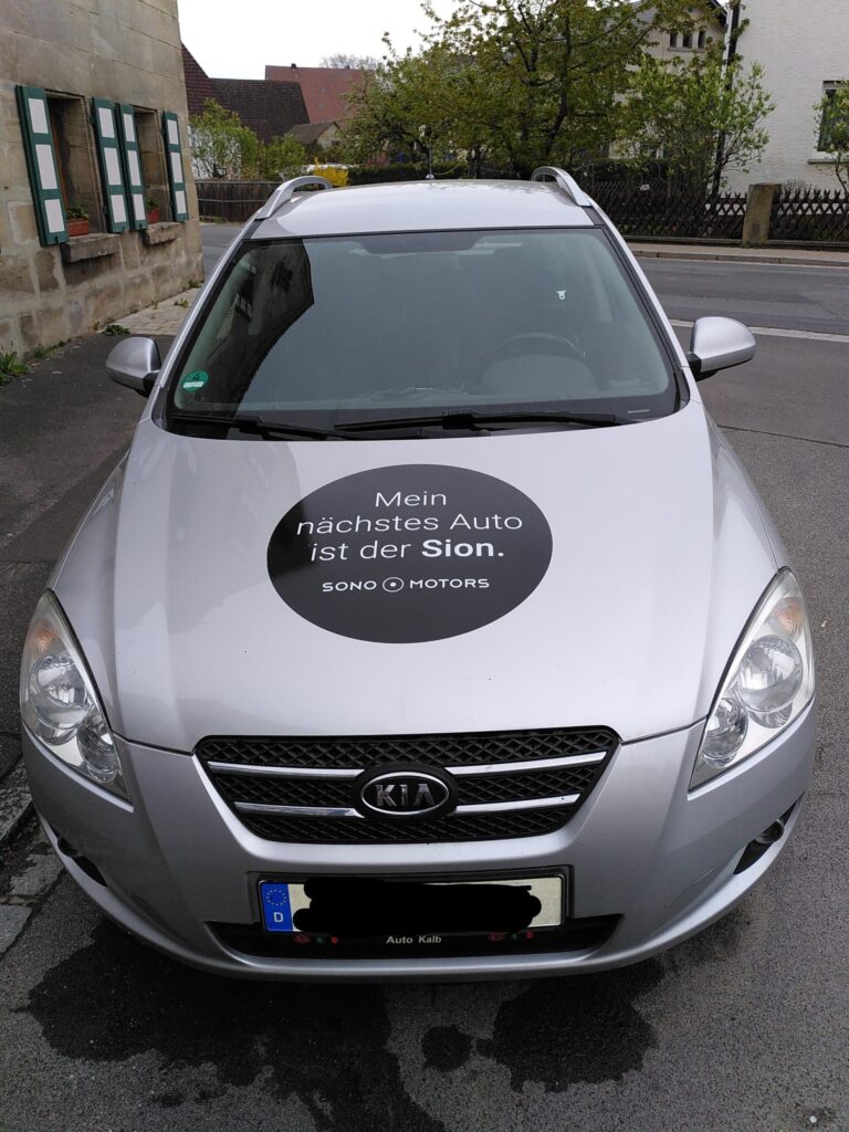 Diese Woche kam ein Geschenk von Sono Motors an: ein Aufkleber für das „Alt“-Auto. Heute bei trockenem Wetter dann das derzeitige Auto beklebt.