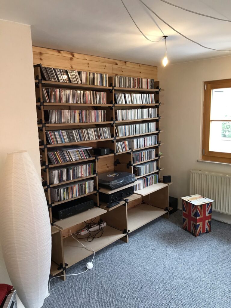 Das Musikregal, nun mit aktivierter Anlage. Was noch fehlt, sind die LPs, hier brauche ich noch einen Träger, der sie mir hochträgt 😎.