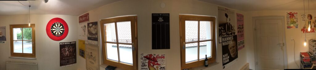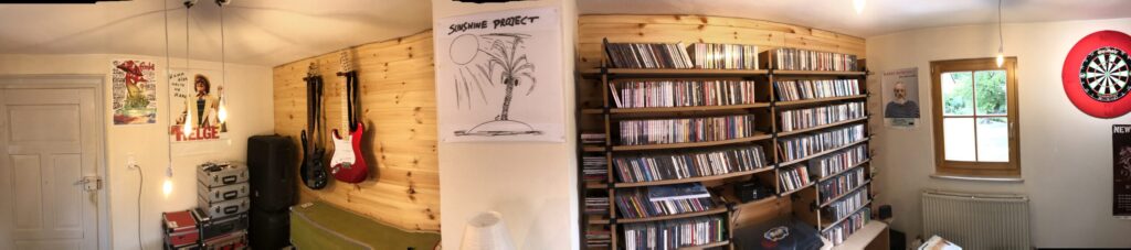 Die Sitzecke mit Lager der Beschallungstechnik, die sich spaßeshalber in den letzten Jahren angesammelt hat. Die Sitzecke ist übrigens ein Geburtstagsgeschenk meiner Liebsten 🙂