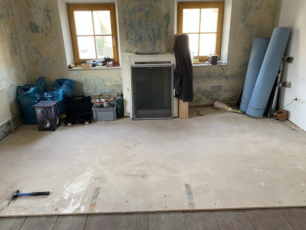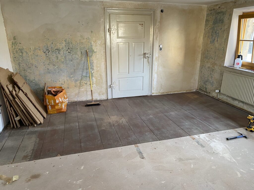 Tapetenreste weggeräumt und angefangen, die unfachmännisch verlegten Verlegeplatten zu beseitigen. Diese waren nur genagelt und auf Kreuzfuge verlegt, hier hätte man auf Versatz achten müssen. Und was kam unter den Spanplatten zum Vorschein? – Der alte Dielenboden, vermutlich aus der Zeit des Hausbaus. Wenn der Rest, der jetzt noch abgedeckt ist, in einem ähnlichen Zustand ist wie der freigelegte Teil, wird der Plan, neues Fertigparkett zu verlegen, verworfen und die alten Dielen werden aufgearbeitet.