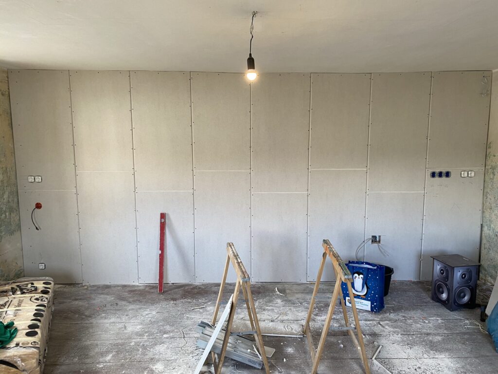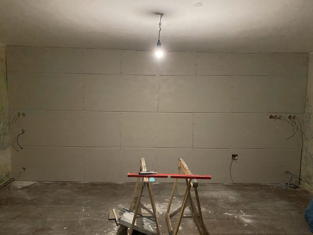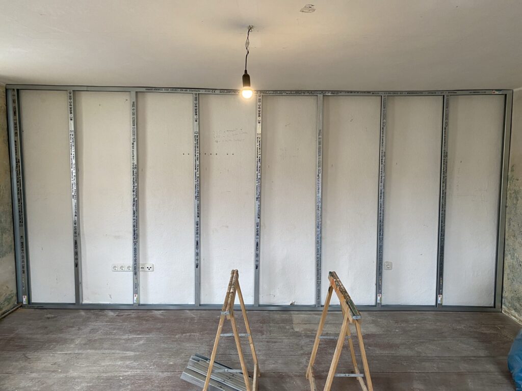 Die Innenwand erhielt eine Trockenbau-Vorsatzschale, um die gewünschte Installation gut unterzubringen, außerdem war die Wand extrem krumm …