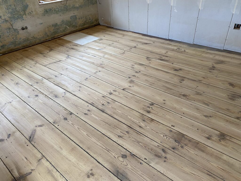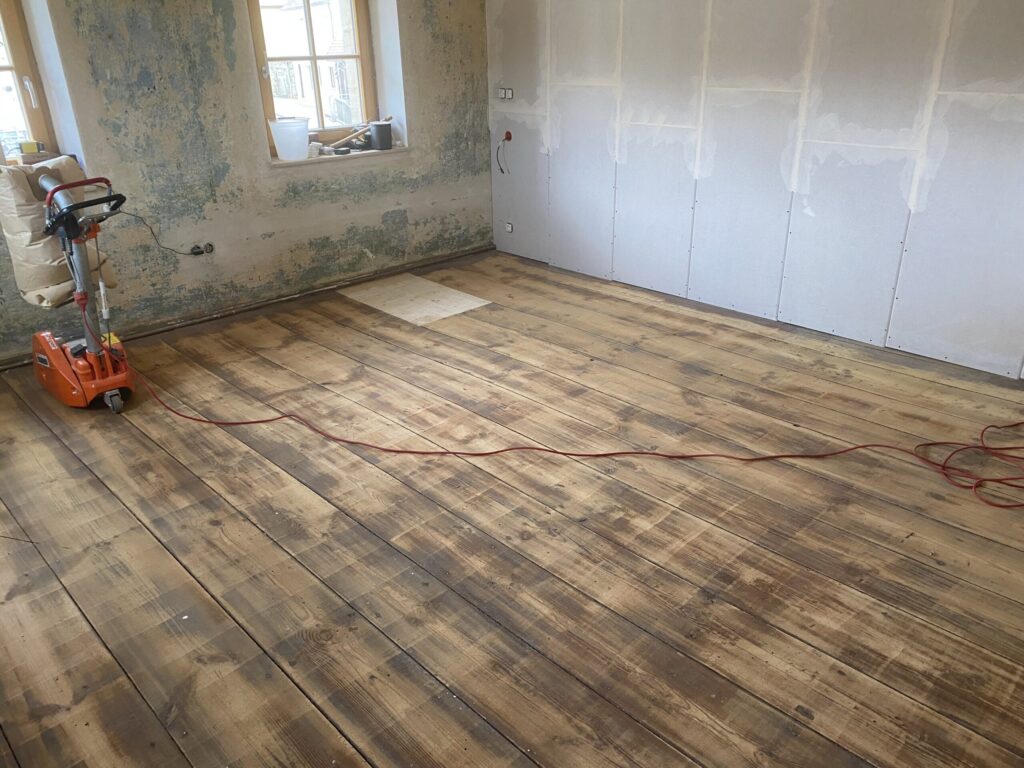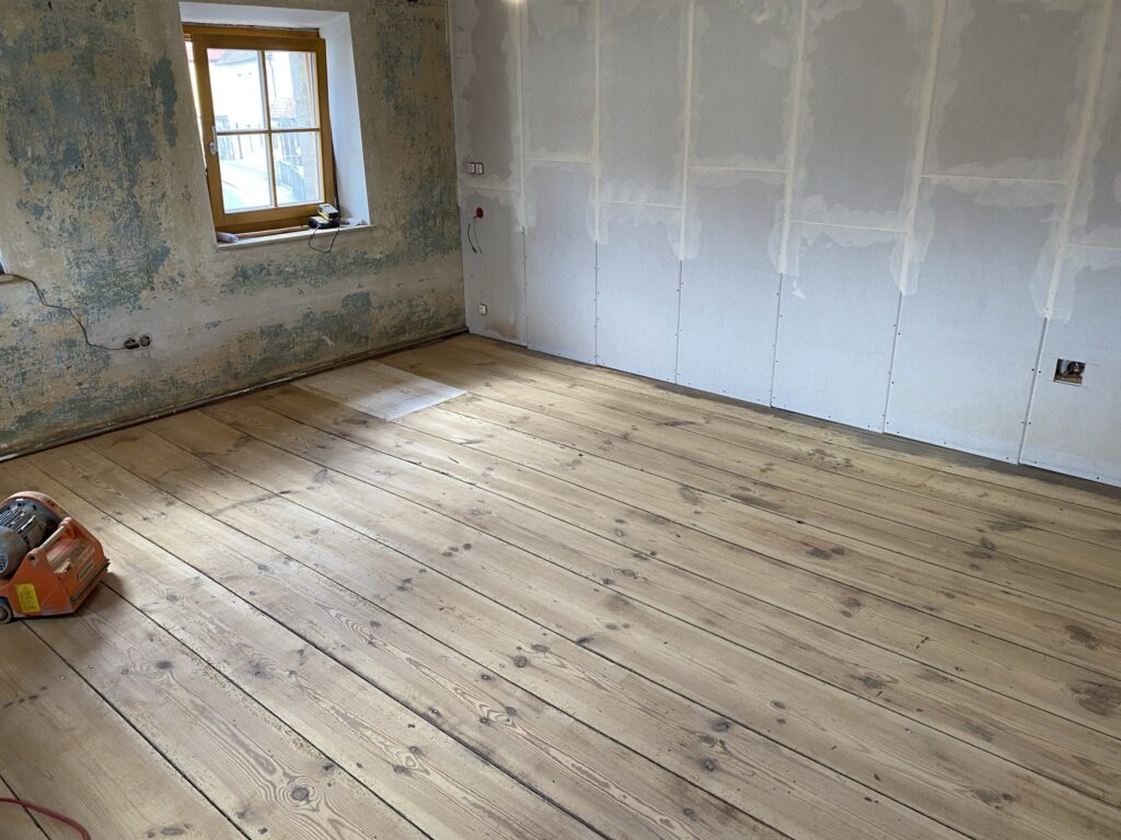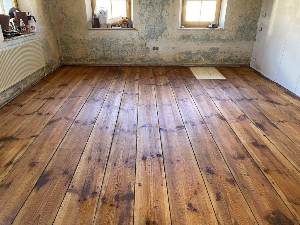 Die Entscheidung, den alten Dielenboden aufzuarbeiten, war unseres Erachtens die richtige. Und mit deutlich geringerem Aufwand als der geplante Eiche-Fertigparkett, da ich dafür den Dielenboden komplett beseitigen müsste, dann die gesamten Unebenheiten ausgleichen und neue Verlegeplatten einbauen hätte müssen. So haben wir einen wohl unebenen Boden, dafür einen mit Charakter. Und er passt zum Haus, er wurde seinerzeit beim Bau des Hauses eingebaut.