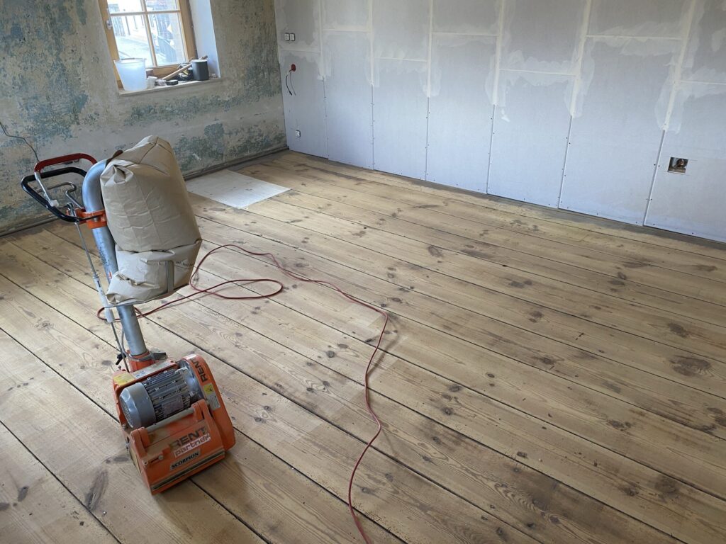Nach dem Desaster von letztem Wochenende mit der falschen Schleifmaschine, die ich mir ausgeliehen hatte (Schleif-und Bohnermaschine), nun dieses Wochenende mit einer Parkettschleifmaschine gearbeitet, und das erfolgreich.